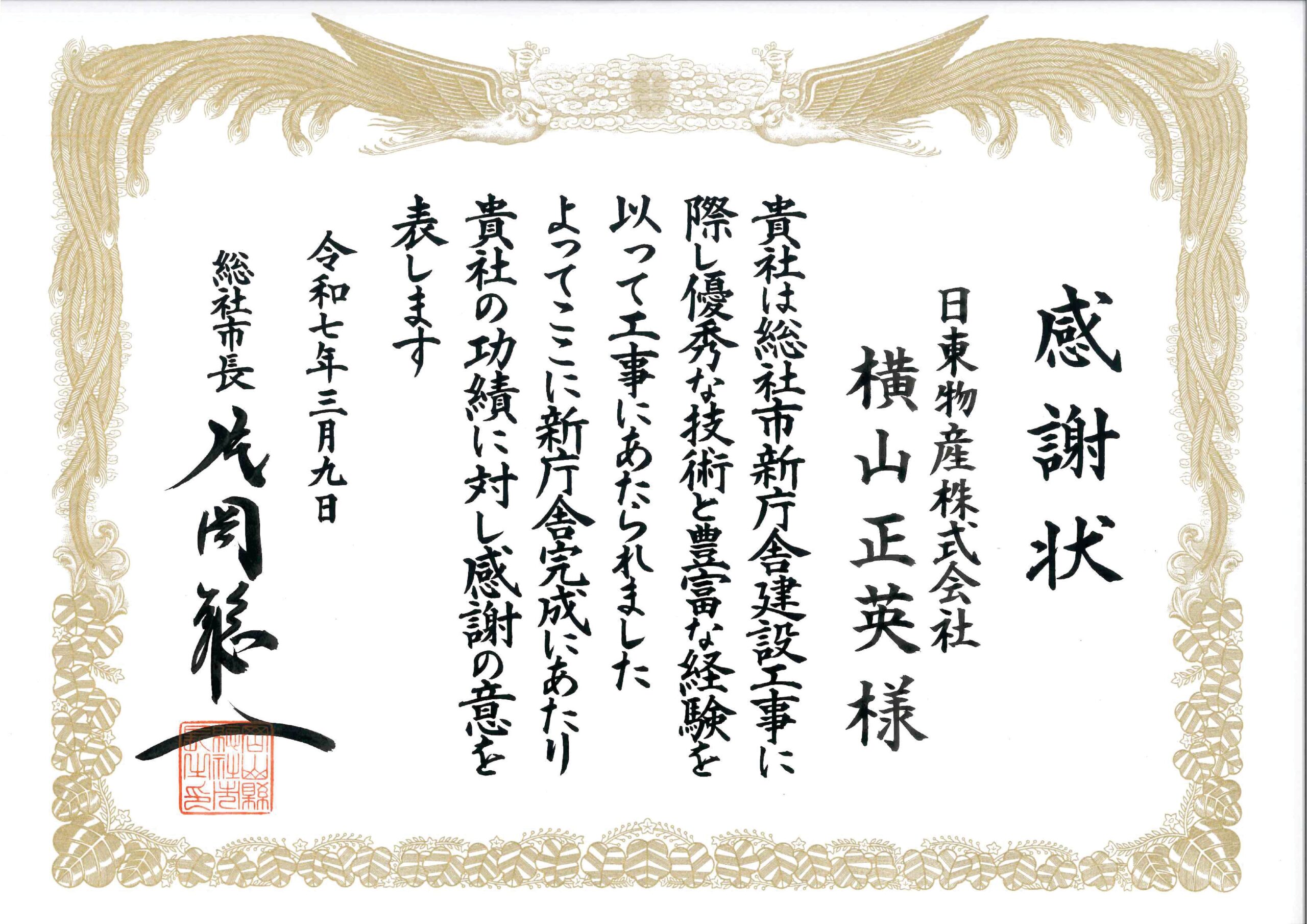 総社市より感謝状をいただきました。